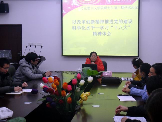 2012年12月30日,“以改革创新精神推进党的建设科学化水平——学习党的十八大精神体会”为主题的永利集团304am登录研究生学术沙龙在雁山校区07415会议室举行。此次沙龙由学院中国特色社会主义理论教研室主任梁英副教授主持。