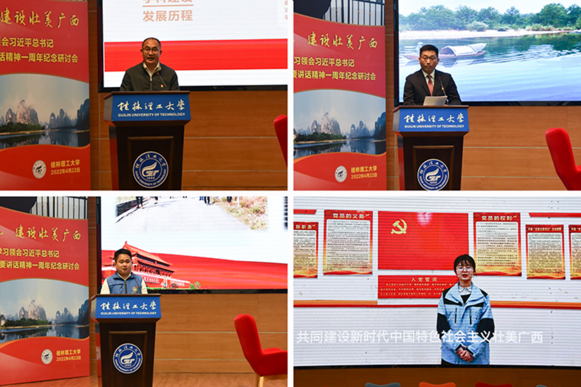 研讨会分为“主题发言”和“访谈对话”两个环节。学校相关师生代表围绕“牢记领袖嘱托,建设壮美广西”主题,分别作题为“赓续共产党人精神血脉,凝心聚力建设铸魂育人示范学院”“牢记领袖嘱托,保护漓江生态环境,弘扬生态文明思想”“巩固拓展脱贫攻坚成果,助力乡村振兴”“做新时代中国特色社会主义事业接班人”的发言,分享他们在各自领域笃行奋斗、勇担使命的生动实践。随后,邀请有关嘉宾就“用活用好红色资源,力行铸魂育人使命”“发挥资源优势,推进乡村振兴”“以科技创新支撑产业高质量发展”“发挥高校智库优势,服务地方经济社会发展”等话题进行深入访谈,重温习近平总书记殷切嘱托,共同为壮美广西建设献计策。