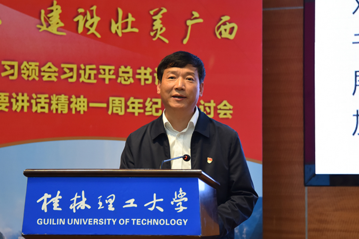 解庆林在讲话中重温了习近平总书记视察广西“4·27”重要讲话内容和精神,阐释了习近平总书记提出“四个新”总要求的重要内涵。他表示,学校切实把学习贯彻落实习近平总书记视察广西“4·27”重要讲话精神作为一项重大政治任务,结合学校办学实际,在加强创新人才和成果供给、助推经济高质量发展,统筹人力资金项目投入、扎实服务乡村振兴,坚持以人民为中心发展思想、持续改善师生群众生活品质,搞好民族团结进步宣传教育、铸牢中华民族共同体意识,扎实开展党史学习教育、切实增强广大师生信仰信念信心等方面采取系列措施,推动了习近平总书记视察广西“4·27”重要讲话精神在学校落地生根、开花结果。